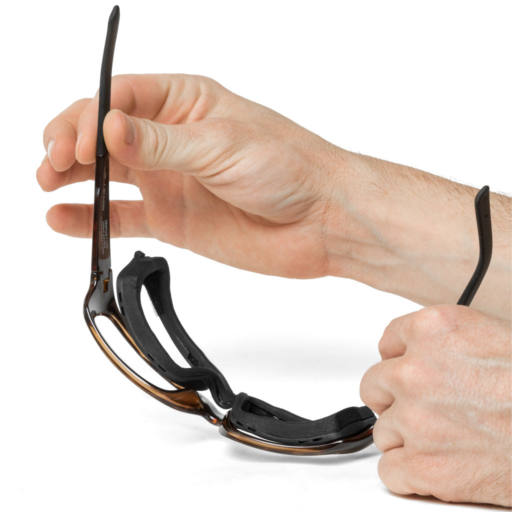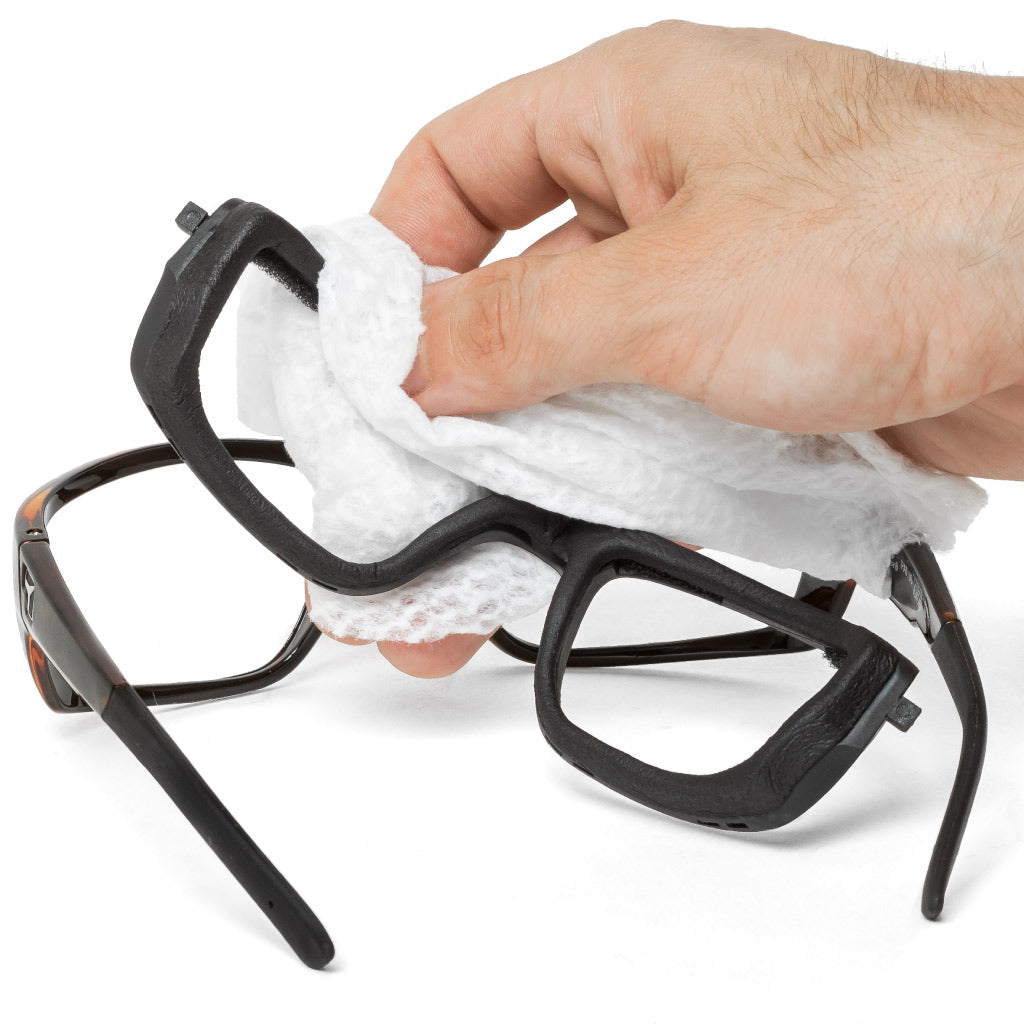 We recommend using wet wipes to clean the frame and eyecup. Baby wipes are preferred if you are worried about harsh chemicals touching the eyeglasses next to your face. Never leave eyewear in direct sunlight when not in use, especially photochromic lenses.